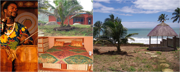 Samuel N Yeboah, Ghanaian drummer and master drum maker invites you to Ghana West Africa for a 2-week cultural visit. Samuel has many years experience hosting such cultural visits to Ghana, from organizing the accommodations, transport and food, to running and organizing workshops, and sightseeing excursions. On this tour you will be staying at a breathtaking ocean front beach cottage in Kokrobite, a drumming, dance and fishing community 45 minutes from Accra, the capital of Ghana. Here you will be a part of the community, take part in your choice of workshop from African drumming, singing, dance, textile design, bead jewelry making or drum making with some of the best artistes and craftspeople in Ghana. During your time you will also visit the waterfall, national parks, museums, arts, crafts, textile and bead markets, local community projects and other historic sites. You will mix with the local people to experience Africa from the inside. You will also have time to relax on the beach and catch inspiration.