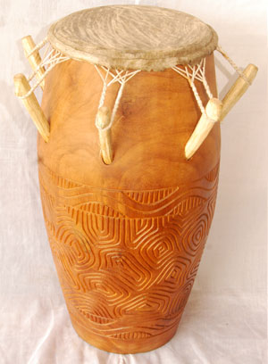 A conga shaped authentic drum from the GA people of the greater Accra region of Ghana in West Africa, the Kpanlogo produces a rich warm, smooth and crisp sound. It is easily tuned and detuned (to match other instruments) by hitting the pegs around it to stretch or loosen the ropes. The Kpanlogo is played with hands can also be played with drum sticks.